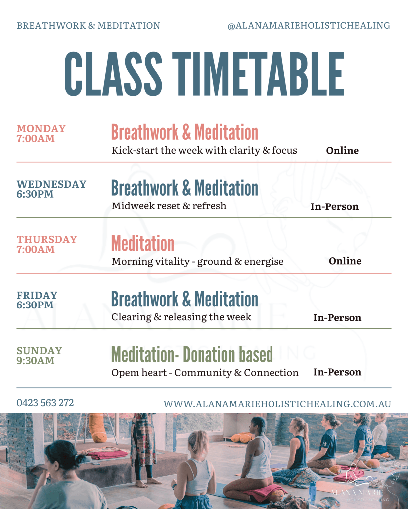 At Alana Marie Holistic Healing I offer weekly classes throughout the week as well as regular retreats where you can experience a variety of mediation styles & intentions.